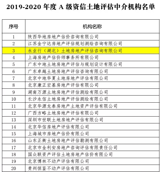 近日, 中國土地估價師與土地登記代理人協會(下稱“中估協”)發布“2019-2020年度A級資信土地評估中介機構”名單,永業行連續12年獲此殊榮,在全國120家A級資信機構中,位列全國第三、湖北第一,排名穩步上升。