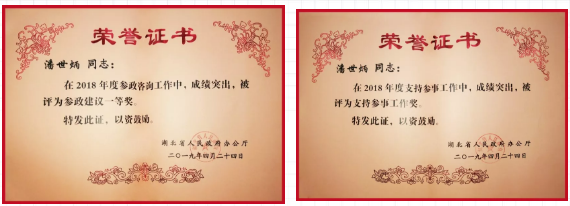 永業行董事長兼總裁、省政府參事潘世炳獲得先進參事獎、參政建議一等獎和支持參事工作獎等三個獎項。辦公廳要求獲獎人員保持榮譽,發揚成績,奮力譜寫新時代湖北高質量發展新篇章。