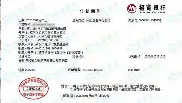 潘世炳是武漢永業行評估咨詢有限公司負責人。據該公司工作人員介紹,雖然潘世炳目前還在外處理業務,但他一直很關注武漢市新冠肺炎防治工作,在他和公司工作人員溝通下,今天下午公司正式將10萬元轉到武漢市青少年發展基金會賬戶,用于支持新型冠狀病毒感染的肺炎疫情防疫工作。