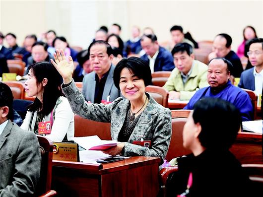 圖為:李燕萍舉手要求提問。﹙湖北日?qǐng)?bào)全媒記者張朋攝﹚