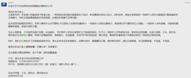 “為眾人抱薪者,不可使其凍斃于風雪??箵舴窝住⑹刈o醫(yī)護人員安全是我們義不容辭的責任。為了讓一線醫(yī)護人員有更加充足、更加安全的保障,永業(yè)行黨委、工會、職代會、青年聯(lián)合會共同倡議募捐,希望大家精誠團結、奉獻愛心、共戰(zhàn)疫情,共同守護我們的家園!”2月1日,一封募捐倡議在永業(yè)行工作群內發(fā)布。潘世炳帶頭捐款,全體黨員和各地員工也迅速響應,不到48小時,收到約700名員工共計20余萬元捐款。截至2月17日,永業(yè)行及千余名員工累計籌得善款近40萬元,陸續(xù)匯入武昌區(qū)慈善總會等慈善機構,期望通過點滴愛心,為戰(zhàn)勝疫情盡永業(yè)行綿薄之力。