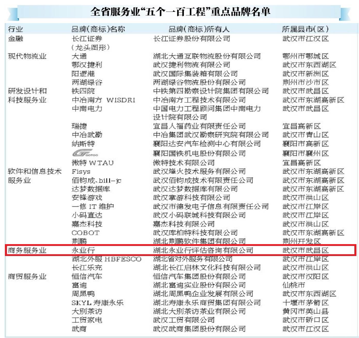 近日,湖北省服務業工作領導小組公布了全省服務業“五個一百工程”重點企業、重點品牌、示范園區名單,永業行獲認定為湖北省服務業重點企業、重點品牌。這是繼2014年以來,永業行再度獲此兩項殊榮。