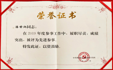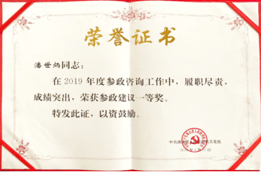 2020年7月,中共湖北省政府機(jī)關(guān)黨組印發(fā)《關(guān)于表彰2019年度先進(jìn)參事和參事工作單項(xiàng)獎獲獎參事的通報(bào)》,省政府參事、永業(yè)行董事長潘世炳榮獲先進(jìn)參事、參政建議一等獎。