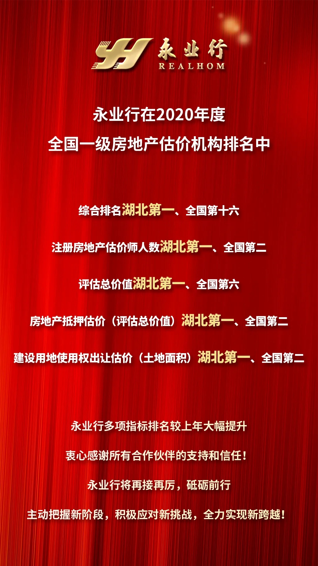 4月1日,中國房地產(chǎn)估價(jià)師與房地產(chǎn)經(jīng)紀(jì)人學(xué)會(huì)公布了2020年度全國826家一級房地產(chǎn)估價(jià)機(jī)構(gòu)排名。永業(yè)行綜合排名湖北第一、全國第十六,注冊房地產(chǎn)估價(jià)師人數(shù)湖北第一、全國第二,評估總價(jià)值湖北第一、全國第六,房地產(chǎn)抵押估價(jià)(評估總價(jià)值)湖北第一、全國第二,建設(shè)用地使用權(quán)出讓估價(jià)(土地面積)湖北第一、全國第二,房地產(chǎn)估價(jià)業(yè)務(wù)收入、評估建筑面積和土地面積等指標(biāo)排名較上年均有大幅提升。