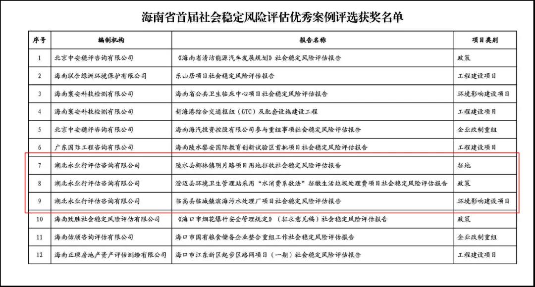 永業行三項成果獲評海南省首屆社會穩定風險評估優秀案例