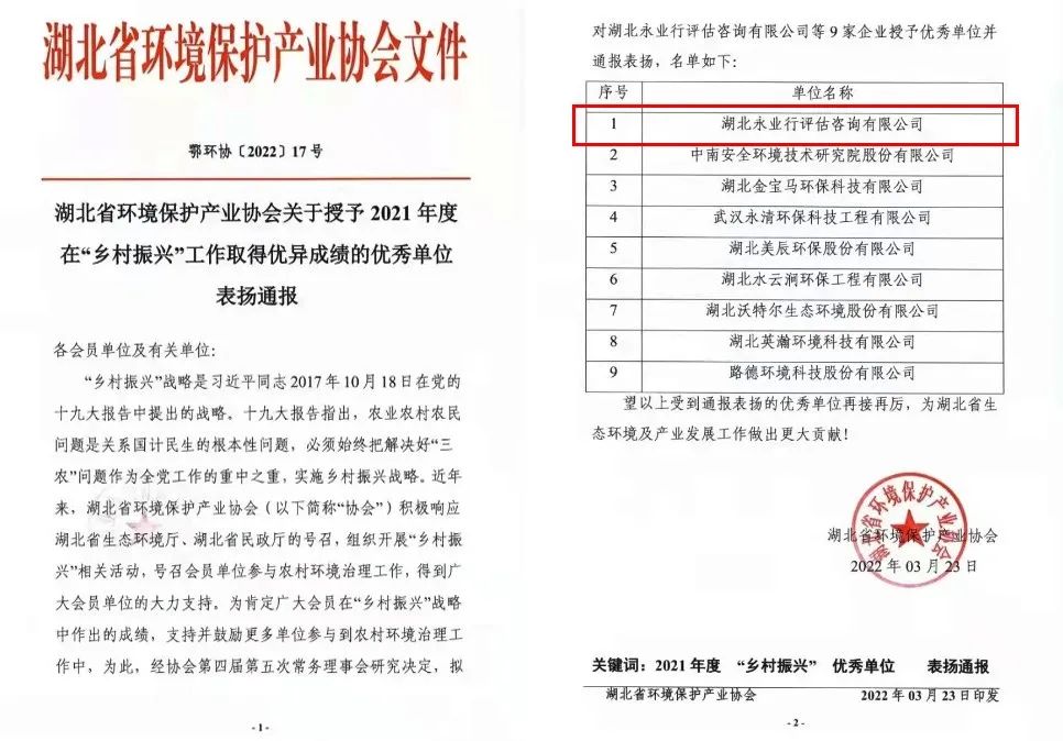 2022年3月23日,湖北省環境保護產業協會發布表揚通報,永業行獲表彰為2021年度“鄉村振興”優秀單位。