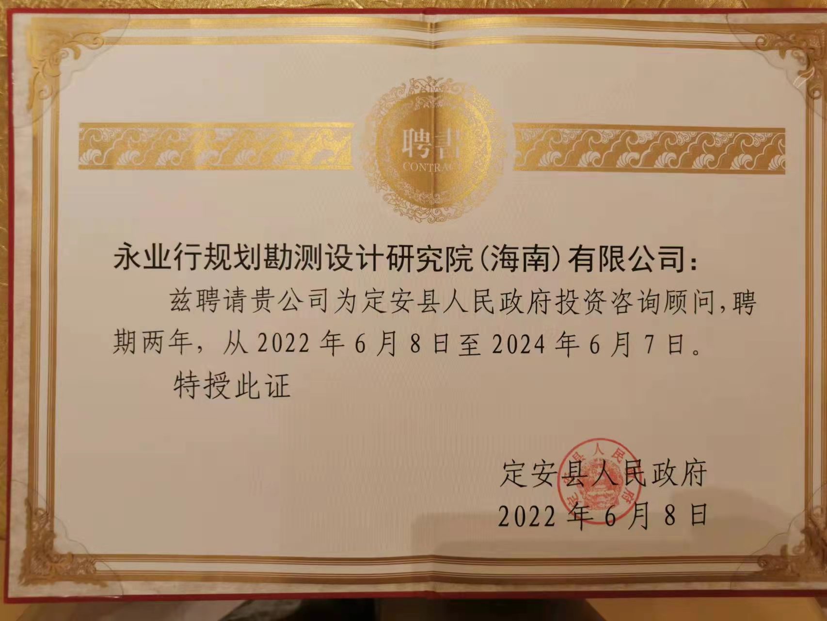 永業行受聘為海南省定安縣政府投資咨詢顧問