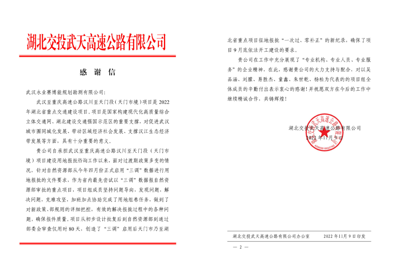 2022年11月,永業行陸續獲湖北交投武天高速公路有限公司、大悟縣自然資源和規劃局致函感謝。