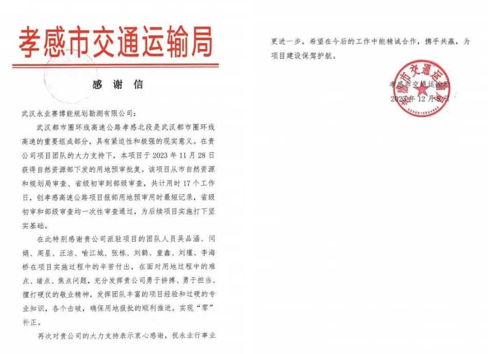 近期,永業行陸續收到湖北省引江濟漢工程管理局、孝感市交通運輸局致函感謝。信中對永業行全力助推項目前期報批咨詢工作,加快基礎設施推進速度,助力經濟高質量發展表示感謝,并給予我司事業蓬勃發展,再創佳績的良好祝愿。