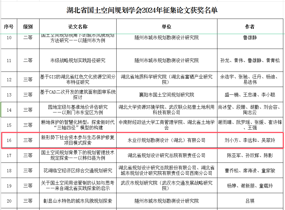 2024年11月20日,2024年國土空間規劃論文征集活動獲獎名單公布,永業行共有2篇論文獲獎,其中一等獎1篇,三等獎1篇。