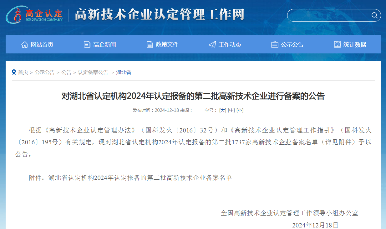 近日,全國高新技術企業認定管理工作領導小組辦公室公布了湖北省2024年第二批國家高新技術企業備案名單,永業行工程項目管理有限公司通過認定。截至目前,永業行成員機構中已有四家獲評國家高新技術企業。
