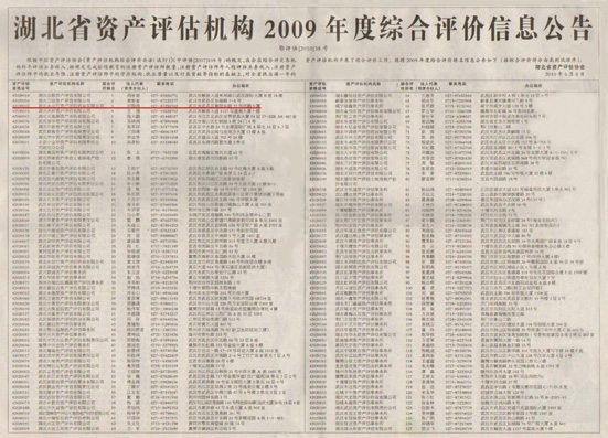在6月8日公布的湖北省資產評估機構2009年度綜合評價排名信息中,湖北永業行資產評估咨詢有限公司(以下簡稱“永業行資產評估公司”)位居第三,排名較2008年度上升了兩位。